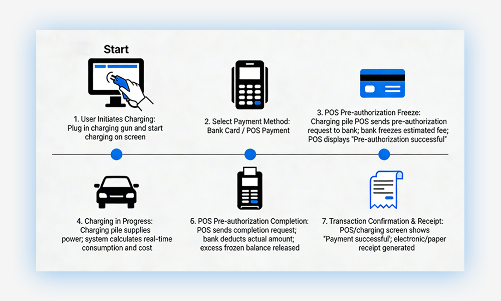 In the payment process for new energy vehicle charging stations, bank card payments via POS terminals are the mainstream method that balances payment security and convenience.